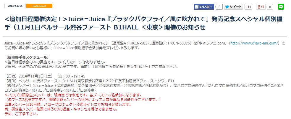 It has been announced that selected members of the Hello! Pro Kenshuusei will participate in Juice=Juice's up-coming individual handshake events for their up-coming single, Black Butterfly / Kaze ni Fukarete.